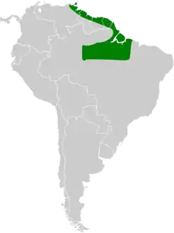 Se distribuye por las regiones costeras del noreste de América del Sur, desde el noreste de Venezuela, Trinidad y Tobago, Guyana, Surinam, Guayana francesa y en la Amazonia en Brasil, principalmente en la porción suroriental.[1]