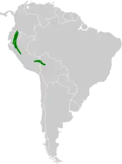 Se distribuye en dos áreas disjuntas, por las tierras bajas a oriente de los Andes, desde el extremo suroeste de Colombia (Putumayo), por el este de Ecuador, hasta el este de Perú (Huánuco), y desde el sureste de Perú (Madre de Dios) hasta el norte de Bolivia (hasta el oeste de Beni).[1]