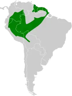 Se distribuye por Guyana, Guayana francesa, Surinam y este de Colombia (desde Guainía y Meta) y sur de Venezuela (extremo suroeste de Amazonas) hacia el sur, oriente de los Andes, a Ecuador, Perú y norte y oeste de Bolivia (Pando, La Paz, Beni y Cochabamba), y la Amazonia brasileña (hacia el sur hasta el noroeste de Mato Grosso y norte de Pará, también el noreste de Roraima y Amapá).[5]