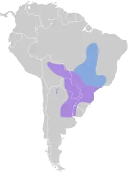 Se distribuye desde el centro de Brasil (sur de Mato Grosso, Goiás y oeste de Minas Gerais hacia el sur hasta el norte de Río Grande do Sul), norte, oeste y este de Bolivia (La Paz, este de Beni y Santa Cruz), Paraguay, oeste de Uruguay, y las provincias del nordeste y noroeste de Argentina (Salta al sur hasta el norte de Tucumán y norte de Córdoba; Formosa y Misiones, Santa Fe, Corrientes y Entre Ríos), llegando por el sur hasta la ribera austral del Río de la Plata, en el nordeste de Buenos Aires.[5][6][7][8] Las polaciones sureñas migran hacia el norte, llegando hasta Tocantins, en Brasil.[1] Registrado como migrante ocasional en el extremo sureste de Perú, en Pampas del Heath, Puno.[9]