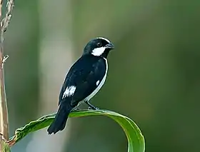 Mide aproximadamente 11 cm de longitud. El macho es de color negro por la cabeza (excepto la frente y las mejillas que son blancas), partes de las alas, garganta y cola, el pecho y el abdomen son de color blanco. La hembra y los ejemplares jóvenes son de un color beige por todo el cuerpo, mientras que el abdomen es un poco más claro. Como otras especies de su género, las hembras y juveniles son indistinguibles.[5]