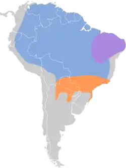 Es un residente reproductivo en el noreste de Brasil (Maranhão y Piauí al este hasta Río Grande do Norte y Alagoas), y al sur de la cuenca amazónica en el sureste de Bolivia (Tarija, Chuquisaca y Santa Cruz), Paraguay, norte de Argentina (al sur hasta Tucumán, Santiago del Estero y norte de Santa Fe; también en Misiones) y sureste de Brasil (centro de Mato Grosso do Sul al este hasta el norte de Río de Janeiro, al sur hasta el centro de São Paulo; posiblemente también en Paraná, Santa Catarina y Río Grande do Sul). Como visitante no reproductivo migra hacia el norte de Sudamérica llegando hasta el este de Colombia, Venezuela, Guyana, Surinam y Guayana Francesa, también hasta el este de Ecuador, este de Perú y la mayor parte de Brasil; probablemente sea regular en Tobago. Registrado como vagante accidental en Panamá y Costa Rica; y en diciembre de 2011 un registro fotográfico en el norte de Chile a la sorprendente altitud de 4250 m.[4]