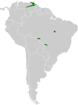 Presenta una distribución muy fragmentada, en el norte de Bolivia (una localidad), este de Venezuela, Guyana, Surinam, Guayana Francesa, la baja Amazonia brasileña y el este y suroeste de Brasil. Es muy raro y local a lo ancho de su rango, pero puede ser bastante común en su hábitat preferencial, y se ha notado bastante común en sabanas cerca de Trinidad en Beni, Bolivia. Hubo unos pocos registros en el este y suroeste de Brasil en años recientes, con uno o dos individuos observados en apenas cinco locales en los estados de Goiás, Bahía, Mato Grosso y Mato Grosso do Sul. Extensas búsquedas hechas por ornitólogos revelan que esta especie es ahora extremadamante rara. Alguna vez existió en el este de Colombia, pero se la considera extinta en esta región.[1]
