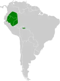 Se distribuye en el sureste de Colombia, este de Ecuador, noreste de Perú y extremo occidental de Brasil (oeste de Acre y oeste de Amazonas); registros recientes en el noreste de Bolivia (norte de Beni, en Llanos de Mojos).[1]