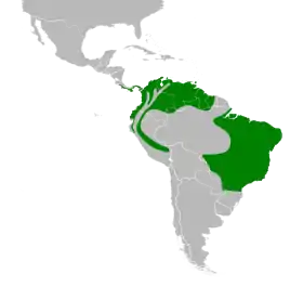 Se distribuye ampliamente desde Costa Rica y Panamá, por Colombia, hacia el sur por la pendiente del Pacífico por Ecuador hasta el noroeste de Perú; hacia el este por Venezuela, Trinidad y Tobago, Guyana, Surinam y norte de Brasil (mayormente al norte del río Amazonas), hacia el sur a oriente de los Andes por el este y sur de Colombia, este de Ecuador, hasta el sureste de Perú; y en una gran área al este del continente, desde el este de la Amazonia brasileña, por el este, centro oeste hasta parte del sur de Brasil (hasta Santa Catarina), extremo este de Bolivia, extremo este de Paraguay y extremo noreste de Argentina (Misiones).[1] En las Antillas menores, es un raro reproductor en Granada y San Vicente y las Granadinas, de donde aparente migra hacia el sur y Costa Rica en la temporada no reproductiva.[5] Se registra su presencia como vagante en Antigua y Barbuda, Barbados, Dominica, Martinica, Montserrat, San Cristóbal y Nieves y Santa Lucía.[1]