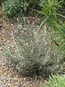 Mata glauca de 1-4 dm; hojas albo-tomentosas por el envés (más verdes por el haz); capítulos terminales con involucro purpurescente, de 15-20 x 3-5 mm; flores púrpuras; aquenios oblongos de 4-5 mm, con vilano de 20-25 mm.