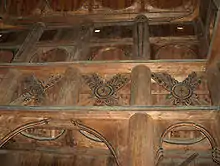 Las soleras superiores sostienen la armadura del techo; ésta consiste de un sistema en tándem formado por un par de cabrios principales (taksperre), que dan la inclinación al techo y sostienen el travesaño, y un par adicional de vigas en tijera (saksesperre), que funcionan como puntales de los cabrios. Tanto cabrios como vigas de tijera parten de un mismo punto en la solera superior. Además, hay viguetas perpendiculares que conectan a cada cabrio con el del lado opuesto; el resultado es una especie de celosía bastante rígida.