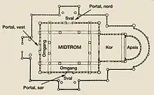 Estas iglesias fueron llamadas anteriormente iglesias de tres naves para distinguirlas de las de Tipo A, de nave única. Esa denominación empleada, entre otros, por Lorenz Dietrichson,[9] ha caído en desuso, pues implicaba que las stavkirke tenían una nave central y dos laterales, es decir, una disposición de basílica.[10] Sin embargo, lo característico de las stavkirke con sala central es un deambulatorio (omgang), que rodea a la sala central (mitrom) por los cuatro costados, a diferencia de las naves laterales. En todo caso, las stavkirke muestran cierta similitud con las iglesias de planta central, con la diferencia que la sala central de las stavkirke es siempre rectangular.
