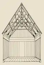 Sobre los cimientos de piedra hay cuatro gruesas vigas de madera (grunnstokker) que se cruzan entre sí y forman un rígido armazón en forma de un signo #. Cada viga se extiende entre 1 y 2 m más allá del punto de intersección. Los extremos de las vigas sostienen las soleras de los muros exteriores, formando un marco cuadrado horizontal independiente del marco cuadrado central formado por las vigas gruesas. Los postes de la sala central se colocan en el cuadro central y son los encargados de sostener el techo elevado de la sala central. En el marco horizontal exterior de soleras reposan las cuatro paredes de tablones con sus postes esquineros, que son las que sostienen el techo bajo del deambulatorio que rodea a la sala central. Así, dando una impresión de basílica, el techo queda dividido en 2 niveles y la sala central y el deambulatorio permanecen divididos por hileras de postes a manera de pilares.