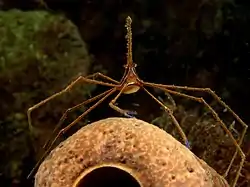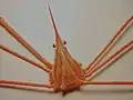 Tiene un característico largo rostro espinoso y unas largas, y muy finas, patas. El apéndice nasal lo utiliza como arpón para atrapar presas.[3] El caparazón y las patas son de color marrón rojizo, y las pinzas de un gris violáceo. Sus articulaciones son de color rojo vivo, con líneas marrones o negras. Sus antenas sensoriales son mucho más pequeñas que las de las langostas o gambas. Todo su cuerpo está recubierto de un exoesqueleto o cutícula fuertemente calcificado, que le brinda protección. Su sistema nervioso es muy compacto y centralizado, si lo comparamos con la mayoría de artrópodos. Los órganos reproductores están, en ambos sexos, en la parte ventral del caparazón. La especie tiene quelíceros que utiliza para atrapar presas, provocar a los rivales y atraer pareja.