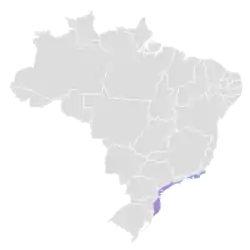 Se distribuye en una estrecha franja costera del litoral del sureste de Brasil, desde el sur de Bahía hasta el noreste de Rio Grande do Sul.[6]
