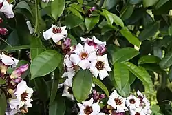 Es una liana leñosa, robusta, con hojas ovaladas, que poseen una costilla central roja. Las flores son acampanadas y vistosas. El fruto contiene semillas alargadas con sedas terminales.