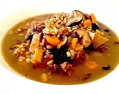 La sopa a menudo incluye cebollas y papas y simplemente se sazona con sal, pimienta negra y hojas de laurel.[1] A menudo se espesa con arroz[3] o empapando cebada en agua durante la noche para que el almidón se filtren en el agua.