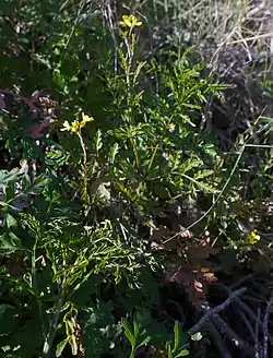 Tiene tallos que alcanzan un tamaño de 20-70 cm de altura, flexuosos, ligeramente volubles, ramificados, subglabrescentes. Hojas inferiores pecioladas, de bipinnatipartidas a bipinnatisectas; las superiores más cortamente pecioladas, pinnatipartidas, con 2-3 pares de segmentos laterales. Las inflorescencias en racimos con 10-40 flores, laxos. Pedicelos de 3 mm en la antesis, de 4,5 mm en la fructificación. Sépalos de 3,5-4 mm. Pétalos de 7-10 mm. Silículas de 3-5 mm de diámetro, con valvas hemisféricas cubiertas de espinas cónicas de 1-3 mm; estilo de 4-8 mm. Semillas de 2-2,5 mm, pardas. Tiene un número de cromosomas de 2n = 36. Florece de febrero a mayo.[2]