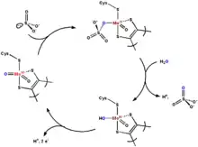 En la primera parte del ciclo catalítico, el sulfito se une con el centro de Molibdeno (IV) y es oxidado a sulfato, con una reducción del centro de Molibdeno por dos electrones para producir especies de Molibdeno (IV) y Hierro (III).