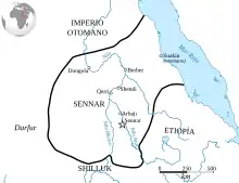 El sultanato de Sennar se expandió rápidamente a expensas de los estados vecinos. Su poder se extendió sobre Gezira, Butana, Bayuda y el sur de Kordofán. Esta expansión originó tensiones con sus vecinos: Etiopía al sureste y el Imperio otomano, al norte; este reforzó sus posiciones, consolidando su dominio sobre el norte de Nubia. Esta frontera septentrional se mantuvo inmutada hasta 1821.