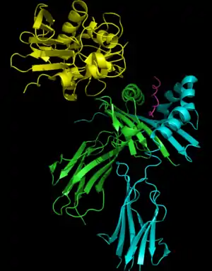 Los dominios tienen regiones de unión para el complejo principal de histocompatibilidad clase II (MHC clase II) y el receptor de células T (TCR), respectivamente.[6]