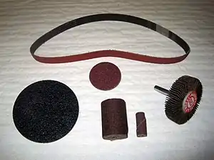 El papel de lija y la tela esmeril son ejemplos de superficies abrasivas para uso manual. Las superficies abrasivas pueden tomar otros formatos tales como correas para lijar, cintas de lijado, y discos. Existen disponibles variantes para ser utilizadas a mano o como partes para herramientas eléctricas tales como pulidoras, herramientas de modelado de piezas de fundición y lijadoras de banda.