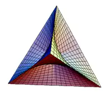 El origen es un punto triple, y cada uno de los planos. , , , es tangente a la superficie en este punto. Los otros lugares de la auto-intersección son puntos dobles, que definen segmentos a lo largo de cada eje coordenado y terminan en seis puntos de aplastamiento. El grupo de simetría de la superficie es el del tetraedro. Más específicamente, son proyecciones lineales de una inmersión en un espacio de 5 dimensiones, llamada superficie de Veronese, que es la imagen de una esfera regular centrada en el origen.