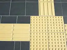 - Pavimentos podotáctiles instalados en una plataforma, en una estación de trenes japonesa. El pavimento horizontal podotáctil, en la parte inferior, indica el lado "interior", alejado de las vías del tren.