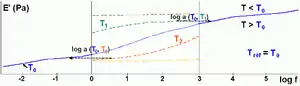 En el rango de frecuencia [ω1, ω2], si la temperatura aumenta desde T0, el módulo complejo E' (ω) disminuye. Esto equivale a explorar una parte de la curva maestra correspondiente a frecuencias inferiores a ω1 mientras mantiene la temperatura en T0. Por el contrario, bajar la temperatura corresponde a la exploración de la parte de la curva correspondiente a las altas frecuencias. Para una temperatura de referencia T0, los cambios de las curvas de módulo tienen el log de amplitud (aT). En el área de la transición vítrea, aT se describe mediante una función homogénea de la temperatura.