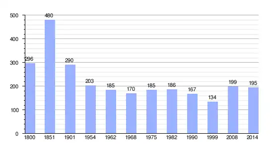 Los datos demográficos contemplados en este gráfico de la comuna de Surville[4] se han cogido de 1800 a 1999 de la página francesa EHESS/Cassini, y los demás datos de la página del INSEE.[5]