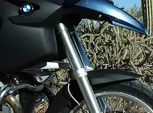 La forma más común de suspensión delantera para una motocicleta moderna es la horquilla telescópica. Otros diseños de horquilla son la girder, suspendida por resortes superiores paralelos (no son comunes desde los 1940s) y diseños de enlace inferior, no comunes desde los 1960s.