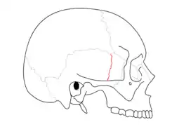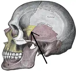 ![]() Vista lateral de la cabeza ósea. La flecha señala la sutura esfeno-escamosa. | ||