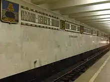 Construida de acuerdo a los estándares de diseño de 1978 y diseñada por el arquitecto Robert Pogrebnoi, la estación cuenta con pilares recubiertos de mármol blanco acentuado con tiras verticales de aluminio anodizado. Las paredes también son de mármol blanco y están decoradas con frisos que contienen los nombres y los escudos de armas de diferentes pueblos y ciudades de la periferia de Moscú.[1]