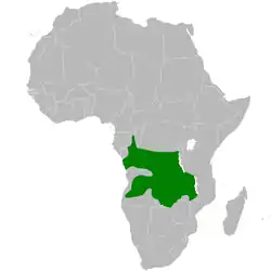 Se la encuentra en Angola, República del Congo, República Democrática del Congo, Malawi, Mozambique, Tanzania, Zambia, Zimbabue, y posiblemente Botsuana. Su hábitat natural son los bosques secos tropicales las zonas de arbustos secos, y las zonas arbustivas tropicales.