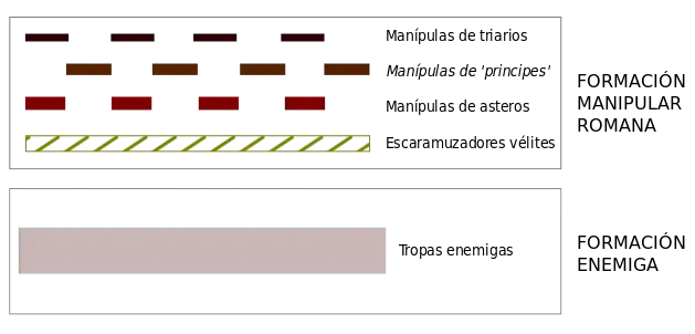 Las falanges que se enfrentaban a la legión resultaban vulnerables al despliegue en tablero romano, más flexible, que permitía a cada luchador un cierto espacio vital donde enfrentarse cuerpo a cuerpo al enemigo en orden cerrado. El sistema manipular también permitía a unidades completas maniobrar de un modo más amplio, libres de la necesidad de permanecer siempre empaquetados en una formación rígida. La profundidad del despliegue en triple línea ejercía una presión constante y hacia adelante. La mayor parte de las falanges utilizaban una línea enorme de varios rangos de profundidad. Esto podía resultar ventajoso en las primeras fases del combate pero, a medida que más y más hombres se veían envueltos en la batalla, la formación modular romana permitía relevos en la presión que se imponían en una línea más amplia. A la par que el combate se alargaba y se comprimía el campo de batalla, la falange quedaba agotada o inmovilizada en una posición, mientras que los romanos podían no solo maniobrar sino realizar los últimos y definitivos ataques.[12]La disposición del ejército de Aníbal en Zama parece dar muestra de ello: los cartagineses utilizaron una disposición de triple línea, sacrificando sus dos primeras líneas de dudosa calidad y manteniendo en reserva a sus veteranos de Italia para el encuentro final. La colocación de Aníbal era muy recomendable dada su debilidad en caballería e infantería pero no pensó en un sistema de relevos entre líneas como hicieron los romanos. Cada línea luchaba su particular batalla y la última finalmente fue destrozada contra el yunque romano al recibir el ataque de jinetes númidas en retaguardia.