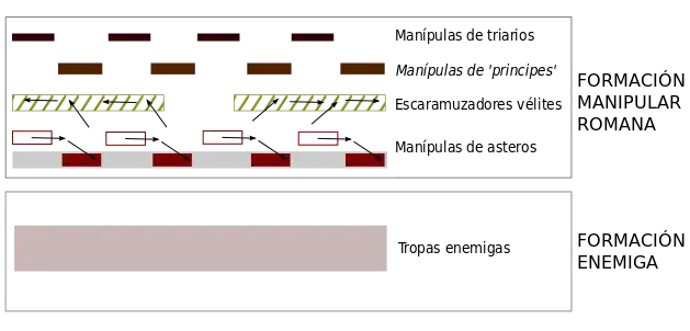 Una vez la maquinaria había comenzado a rodar, la infantería romana era por regla general desplegada, como cuerpo principal, de frente al enemigo. Durante el despliegue en la era romana, los manípulos se disponían comúnmente en triplex acies (triple orden de batalla): es decir, en tres niveles, con los asteros en primera fila (la más cercana al enemigo), los principes en segunda, y los veteranos triarios en la tercera y última, en posición de rodillas, para que no se lanzaran de improviso al fragor de la batalla, o, en ocasiones, incluso más atrás como reserva estratégica. Cuando se sufría una derrota, la primera y segunda línea (principes y "hastatos") retrocedían hasta los triarios para recomponer las líneas y efectuar un contraataque o retirada organizada. Dado que retroceder hasta los triarios era una medida desesperada, la frase "bajar a los triarios" (ad triarios rediisse) se convirtió en una frase típica romana para referirse a una situación desesperada.[11]