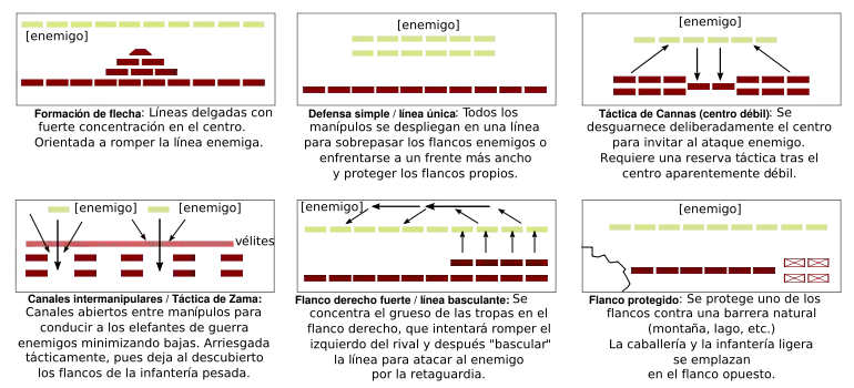 El capítulo previo relataba los procedimientos estándar, y era modificado a menudo. Por ejemplo, en Zama, Escipión desplegó toda su legión en una única línea para envolver a Aníbal, tal y como este último había hecho en la batalla de Cannas. En la imagen se aprecia un breve resumen de las distintas formaciones alternativas: