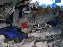 Al campamento improvisado para pernoctar al aire libre se lo denomina vivac[14] o vivaque.[15] Las técnicas de su creación y mantenimiento son parte del entrenamiento de militares,[16] escultistas y montañeros.