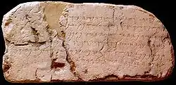 ... la perforación. Esta es la historia de la perforación. Cuando todavía [...] pico(s) [....] cada uno hacia su compañero y cuando todavía faltaban perforar tres varas, [...] la voz de un hombre que le gritaba al otro, pues allí había una brecha del lado derecho [...] Y el día de la ruptura se encontraron los trabajadores, hombre contra hombre, pico contra pico, y el agua fluyó de la fuente hacia el estanque, 1200 varas, y de 100 varas era el grosor de la roca por sobre las cabezas de los trabajadores.[3]
