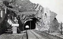 El crecimiento de la demanda de tráfico de trenes hace que en el año 1899 se instale una segunda vía y se ensanche el túnel 70 centímetros[8] pues el ancho de los vehículos operados a finales de siglo había aumentado respecto a los diseños originales[3]. Sus dos entradas son proyectadas como arcos triunfales en homenaje al hombre que consigue triunfar frente a los obstáculos de la naturaleza. Fueron construidas en piedra, flanqueadas por dos grandes columnas de planta cuadrada y dos pequeñas ventanas coronadas por capiteles lisos. Sobre los arcos de medio punto que dan entrada al túnel y uniendo ambas columnas se alza un pequeño muro almenado que hace al conjunto simular la puerta de un castillo. [9]