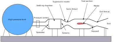 Un túnel de viento supersónico es un túnel de viento que produce velocidades supersónicas (1.2<M<5) El Mach el número y el flujo están determinados por la geometría de la tobera. El número de Reynolds se varia cambiando el nivel de densidad (presión en la cámara de sedimentación). Por lo tanto, se requiere una proporción de alta presión (para un régimen supersónico en M=4, esta proporción es de orden de 10). Aparte de eso, la condensación de humedad o incluso la licuefacción del gas puede ocurrir si la temperatura estática se enfría lo suficiente. Esto significa que un túnel de viento supersónico generalmente necesita una instalación de secando o de pre-calentamiento. Un túnel de viento supersónico tiene una gran demanda de potencia, por lo que la mayoría están diseñados para un funcionamiento intermitente en lugar de uno continuo.