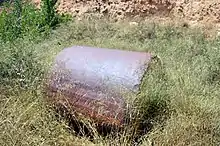 Detalle del rulo utilizado como apisonadora en la construcción de la carretera N-330a (antigua C-234), en Casas Bajas, 2018.