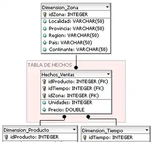 Cuando las tablas de dimensión asociadas a una tabla de hechos no reflejan ninguna jerarquía (por ejemplo: Las zonas siempre son 'provincias' y solo provincias, el tiempo se mide en 'días' y solo en días, etc.) el cubo resultante tendrá forma de estrella, es decir, una tabla de hechos central rodeada de tantas tablas como dimensiones, y solo habrá, además de la tabla de hechos, una tabla por cada dimensión.