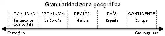 La unidad de medida (por localidades, provincias, etc.) determinará esa granularidad, cuanto más pequeña sea esta unidad de medida más fina será esta granularidad (grano fino); si las unidades de medida son mayores, entonces hablaremos de granularidad gruesa (grano grueso).