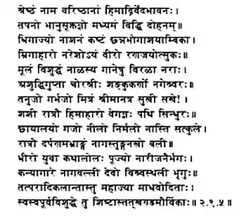 La siguiente imagen muestra la tabla de senos de Madhava incluida en elDevanagari, reproducida en la obra de C. K. Raju titulada "Cultural Fundations of Mathematics" (Fundamentos culturales de las matemáticas).[1] Las primeras doce líneas constituyen las entradas en la tabla. La última palabra en la decimotercera línea indica que se corresponden "según lo dicho por Madhava" (véase la primera imagen del artículo).