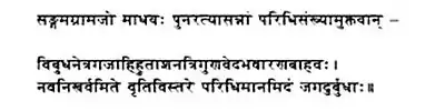 Las diversas palabras indican ciertos números codificados en un esquema conocido como el sistema bhūtasaṃkhyā. El significado de las palabras y los números codificados por ellas (comenzando con el lugar de las unidades) se detallan en la siguiente traducción del versículo: "Dioses (vibudha : 33), ojos (netra : 2), elefantes (gaja : 8), serpientes (ahi : 8), incendios (hutāśana : 3), tres (tri : 3), cualidades (guṇa : 3), vedas (veda : 4), nakṣatras (bha : 27), elefantes (vāraṇa : 8) y armas (bāhavaḥ : 2) - los sabios dicen que esta es la medida de la circunferencia cuando el diámetro de un círculo es nava-nikharva (900.000.000.000)".