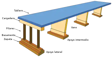 Así mismo, el término tablero[3] también hace referencia al elemento estructural sobre el que se apoya la calzada de un puente, haciendo extensiva a cualquier tipo de puente la denominación del conjunto de tablas con el que se habilita el paso en los puentes de madera.