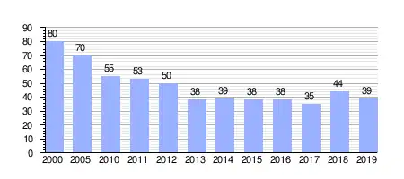 Gráfica de evolución demográfica de Tabuyuelo de Jamuz entre 2000 y 2019 |