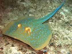 La raya de arrecife (Taeniura lymma) es una especie de elasmobranquio rajiforme de la familia Dasyatidae (rayas látigo). Tiene manchas azules dispersas que contrastan sobre un cuerpo verdoso o grisáceo. Este pez tiene una espina tóxica en la base de su cola y es capaz de clavar su peligroso aguijón si se ve amenazado. Se encuentra en zonas arenosas junto arrecifes del Océano Índico principalmente.