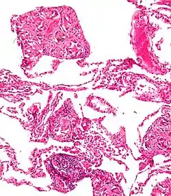 Se ha relacionado con silicosis resultante de la inhalación de talco y silicatos. También está ligado al consumo de heroína donde podría ser usado el talco utilizado como un adulterante para aumentar el peso en las ventas de calle, por lo que la inyección de heroína con talco diluido causa talcosis ..."[1]
