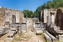 El monumento no fue, sin embargo identificado, en las grandes excavaciones de finales del siglo XIX. En la zona donde, según la descripción de Pausanias, debía encontrarse el edificio, los arqueólogos alemanes profundizaron en la zona comprendida ente la Palestra y el Leonideo,[2] hallaron los cimientos de una edificación antigua, cuyos gruesos muros eran de época imperial romana.[3] La planta del edificio originario poseía unas dimensiones de base coincidentes con la cella (sala central) del Templo de Zeus Olímpico (32,18 x 14,50 metros).[2]