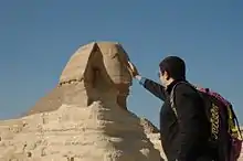 Una ilusión óptica de la perspectiva donde se distorsiona la medida de la esfinge junto con la del humano.