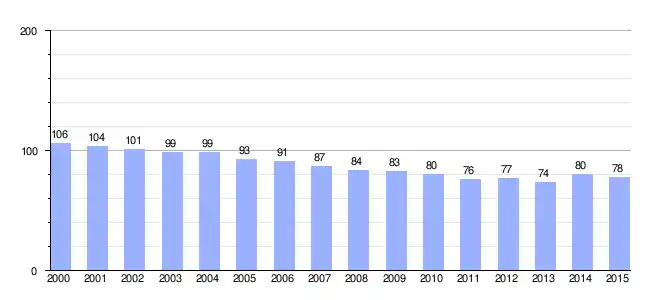 Gráfica de evolución demográfica de Tamame[14] entre 2000 y 2015 |