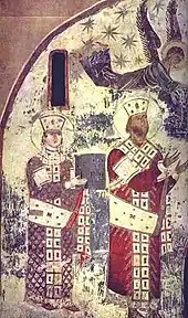 - Según Toumanoff, la tía paterna de Tamara era abuela de los Comneno por parte de su padre,[57] pero esta teoría requiere verificación adicional.[58] Cualquiera que sea la naturaleza de su relación, después de la muerte del emperador Andrónico I y su padre Manuel, la reina Tamara proporcionó refugio a los jóvenes en la corte georgiana, donde posiblemente fueron criados y educados.[59]